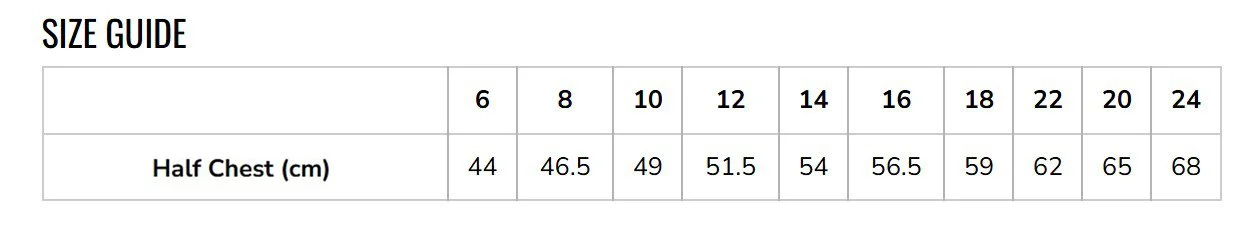 Width measurements are from seam to seam, under the armpit, with the garment lying flat.